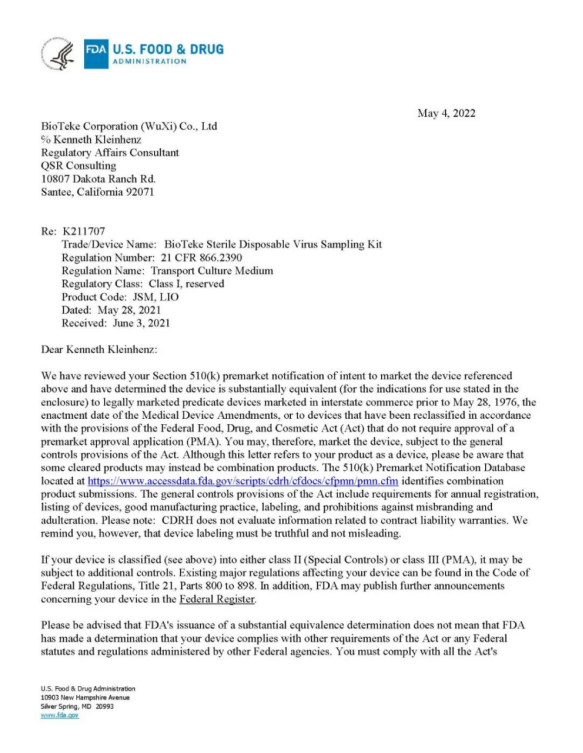 5月4日,百泰克生物的一次性使用病毒采樣管取得美國FDA 510K注冊批件,成為該類產(chǎn)品首個獲此國際權(quán)威認(rèn)證的中國企業(yè)。