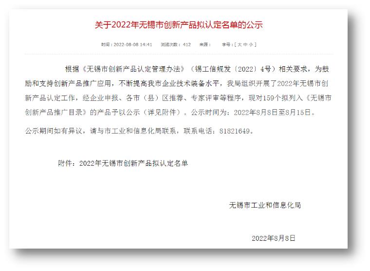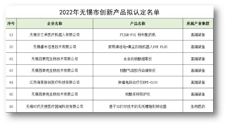 日前,市工信局的2022年無錫市創新產品擬認定名單公示結束,全市共有126企業的159個產品入選。生命園的安之卓醫療、睿米信息、時代天使、海萊新創、百泰克生物5家企業的7個產品入選,其中,百泰克一舉入選3個產品。