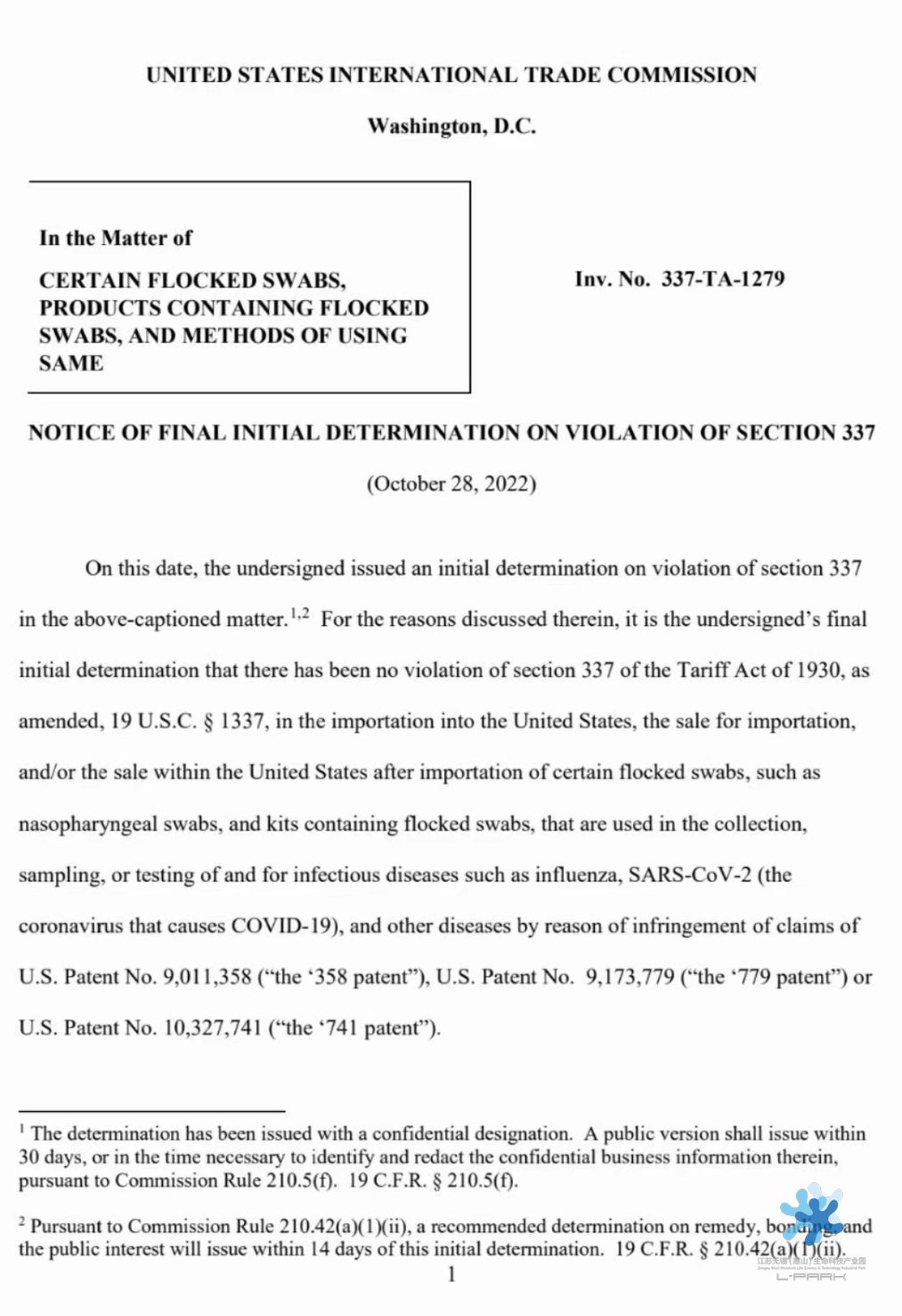 (美國華盛頓時間)10月28日,美國國際貿(mào)易委員會(ITC)就Copan?Italia S.P.A 、Copan Industries,?Inc主張對美出口、在美進口及銷售的植絨拭子侵犯其專利權(quán)申請調(diào)查發(fā)布公告,宣布無錫百泰克生物技術(shù)有限公司等五家中國企業(yè)的植絨拭子不侵犯其相關(guān)專利權(quán);意味著橫梗中國植絨拭子出口美國市場的專利障礙已消除,拭子產(chǎn)業(yè)出海之路暢行無阻。