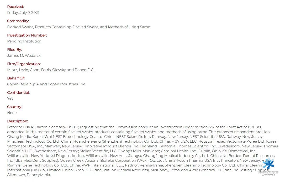2021年7月9日,Copan根據(jù)337條款向ITC提出申請,主張對美出口、在美進口及銷售的特定植絨拭子及其下游產(chǎn)品和方法侵犯其專利權(quán),建議ITC列為指定應(yīng)訴方的中國企業(yè)共有8家,百泰克生物決定聯(lián)合其他企業(yè)積極應(yīng)訴。