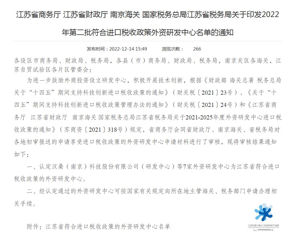 12月14日,江蘇省商務廳、江蘇省財政廳、南京海關和江蘇省稅務局聯合發布2022年第二批符合進口稅收政策的外資研發中心名單,全省共7家企業新獲認定,無錫生基醫藥科技有限公司為本次無錫唯一一家。至此,無錫共有10家外資研發中心新獲認定或通過復核,其中惠山區兩家—保諾生物與生基醫藥,均為惠山經開區生命園企業。