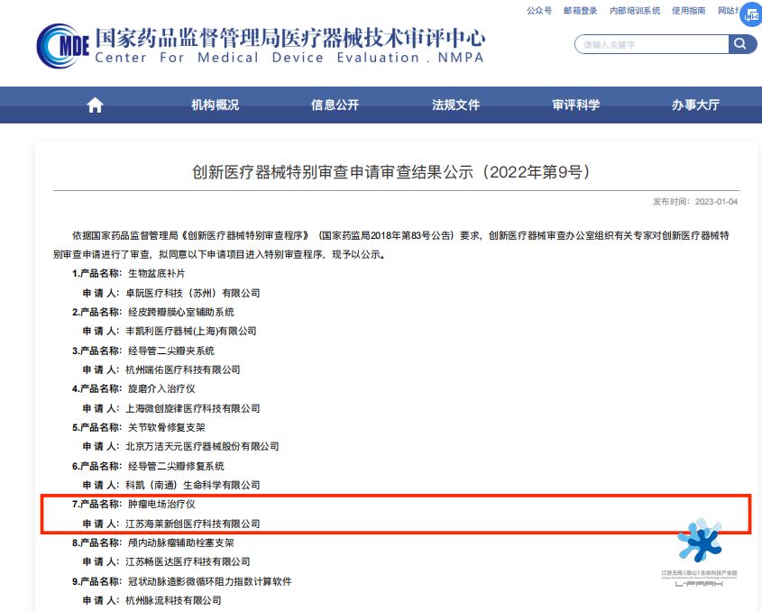 日前,國家藥品監督管理局醫療器械技術審評中心公布2022年第9號創新醫療器械特別審查申請審查結果,江蘇海萊新創醫療科技有限公司的三類醫療器械——腫瘤電場治療儀通過創新醫療器械特別審查,成為2022年度惠山生命園第三個獲認定的創新醫療器械產品。