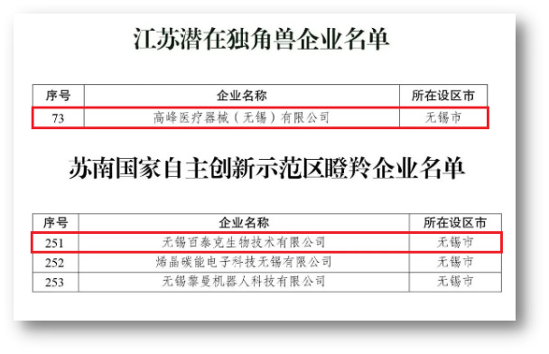 日前,江蘇省生產力促進中心公布“2023年江蘇獨角獸企業和蘇南國家自主創新示范區瞪羚企業”評估結果,惠山經開區分別摘得潛在獨角獸企業1家和瞪羚企業3家;其中,生命園的高峰醫療器械(無錫)有限公司入選“江蘇潛在獨角獸企業”,無錫百泰克生物技術有限公司入選“蘇南國家自主創新示范區瞪羚企業”。