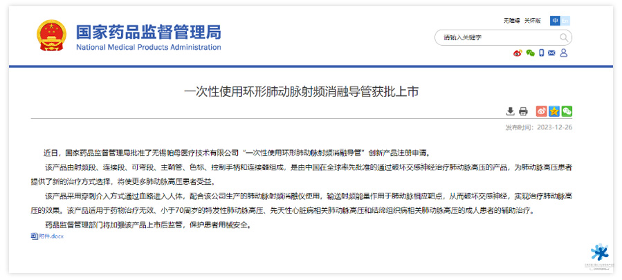 ? ? ? ?日前獲悉,帕母醫(yī)療自主研發(fā)的一次性使用環(huán)形肺動脈射頻消融導管于2023年12月22日獲得國家藥品監(jiān)督管理局(NMPA)批準上市,即將于取得生產許可證后開啟產業(yè)化,引領全球肺動脈高壓介入治療的新時代。